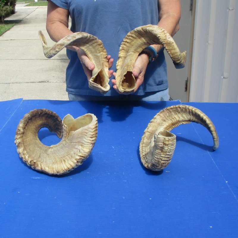 4 piece lot of sheep horns, ram horns imported from India and Africa. - Review photos. These ram horns, sheep horns measure between 25-26 inches measured around the curl of the horn. Ram horns and sheep horns are used in horn craft, making blowing horns, furniture legs, lamps, sconces, knife handles, cane handles, inlaid crafts and numerous other taxidermy crafts.