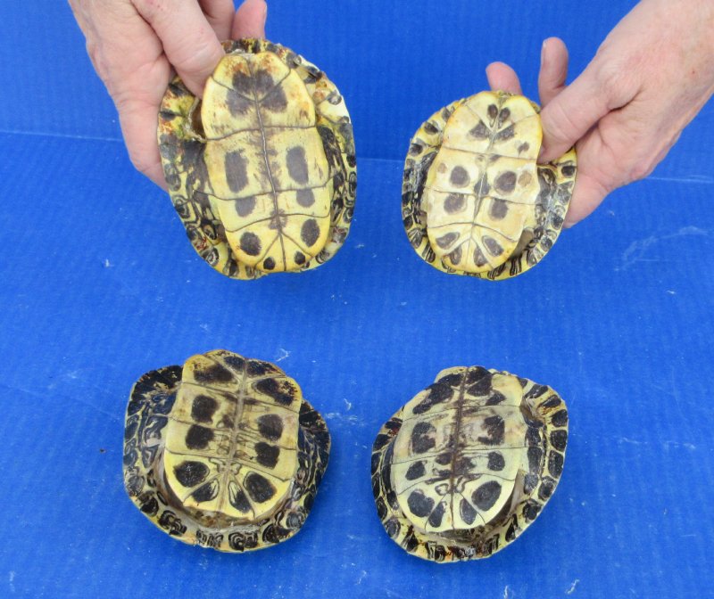 4 piece lot of Red Eared Slider Turtle Shells measuring approximately 4 to 4-7/8 inches long.  Review all photos. The red eared slider is a cold-blooded animal and will usually be found during the day sitting in the sun on a rock, log, or any stumps that are near the water. Some red eared sliders can even be found stacked up to three high, basking in the sun. While the red eared slider is very hard of hearing, they are sensitive to vibration and are very alert while they are basking. These vibrations allow the red eared slider the time to make their hasty retreat into the water if they feel threatened in any way. These are empty turtle shells from real turtles and will have natural imperfections from living and aging in nature.