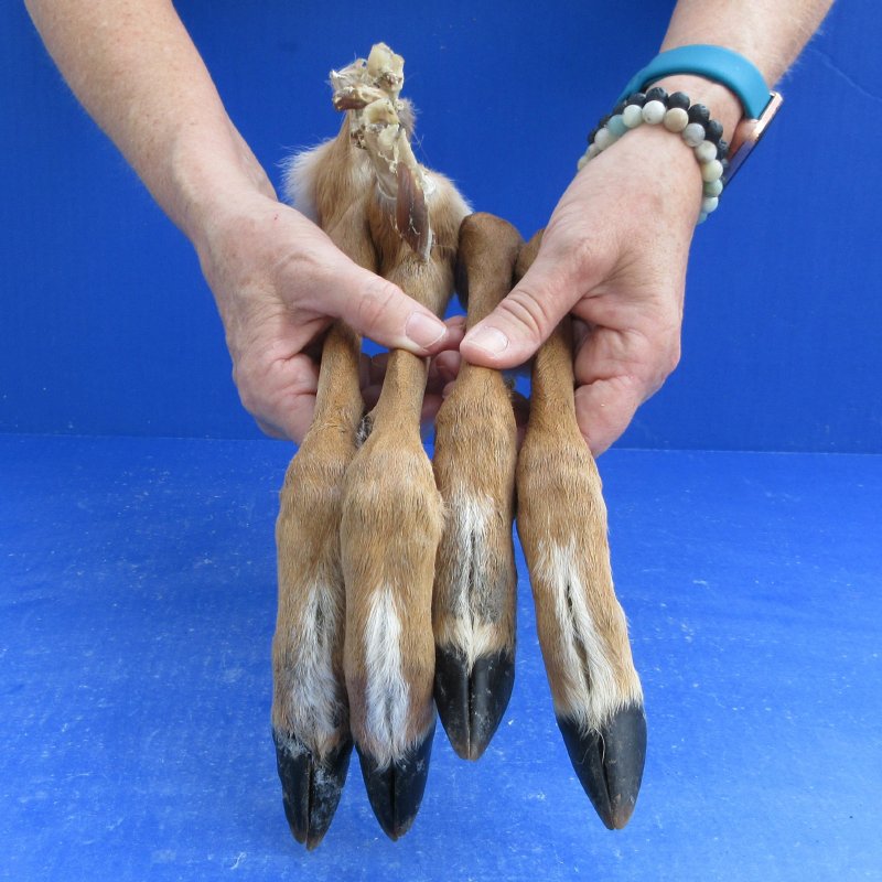 4 piece set of Preserved Deer Legs for sale, measuring approximately 12 to 16 inches in length. Review all photos. These legs are from wild deer and will have natural imperfections that would be found on all wild animals (scratches, bald spots, blemishes, etc.). They have been rough cut and will have a slight odor from the preservation process that will subside over time.