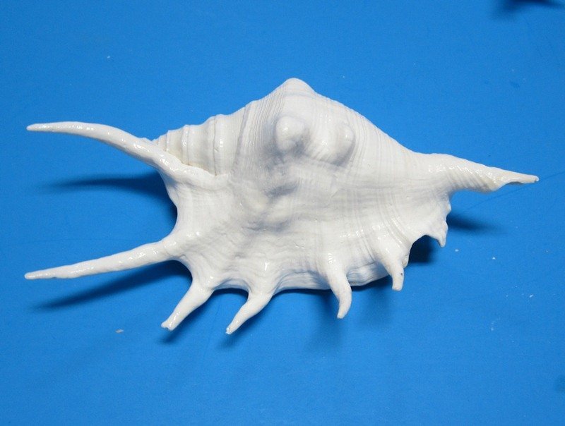 Wholesale white common spider conch, lambis lambis.  These white shells measure approximately 4 inches to 6 inches are used in shellcraft projects. The front of these lambis spider conch shells are dyed white. The backs of the spider conch shells are natural color. White shells are used in shell crafts and are used as wedding shells.
