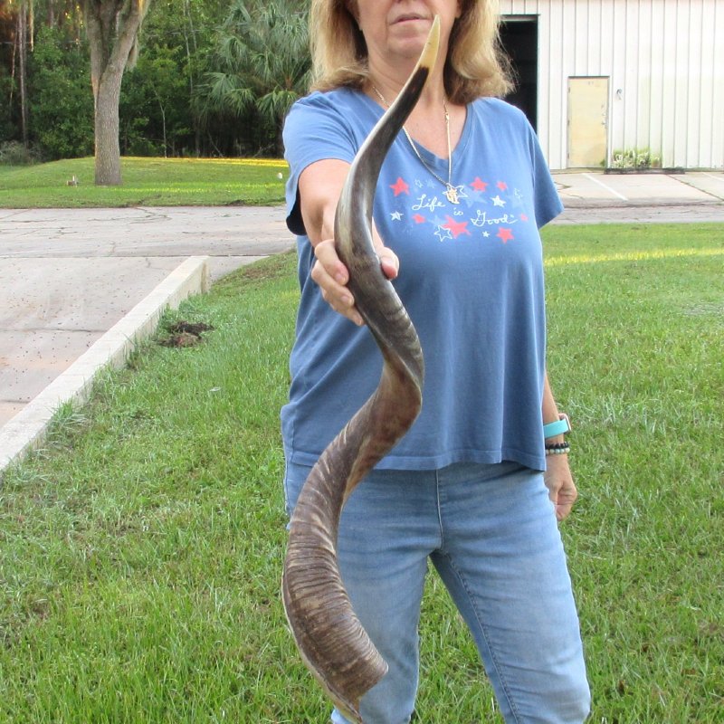Polished Kudu Horn for sale (Tragelaphus strepsiceros) for sale imported from South Africa, measuring approximately 42-1/2 inches. - Review all photos. You will receive the horn shown in the photo. All horns are measured around the curve of the horn using a cloth tape measureAll of our horns are commercial grade and imperfect. They will have imperfections due to the natural aging process and living in the wild--scars, blemishes, rub areas, worm holes, etc. This horn was cleared by the U.S Fish and Wildlife Services and U.S Customs Services for legal entry into the United States. It was obtained from the African Government's Culling Program.