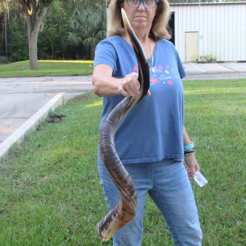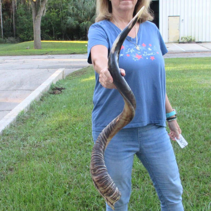 Polished Kudu Horn for sale (Tragelaphus strepsiceros) for sale imported from South Africa, measuring approximately 45 inches. - Review all photos. You will receive the horn shown in the photo. All horns are measured around the curve of the horn using a cloth tape measureAll of our horns are commercial grade and imperfect. They will have imperfections due to the natural aging process and living in the wild--scars, blemishes, rub areas, worm holes, etc. This horn was cleared by the U.S Fish and Wildlife Services and U.S Customs Services for legal entry into the United States. It was obtained from the African Government's Culling Program.