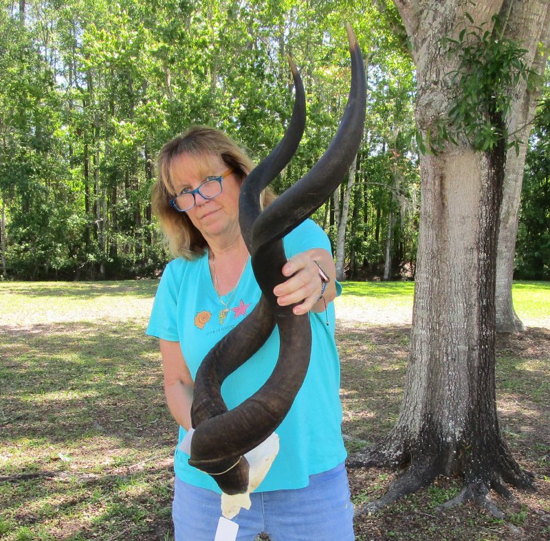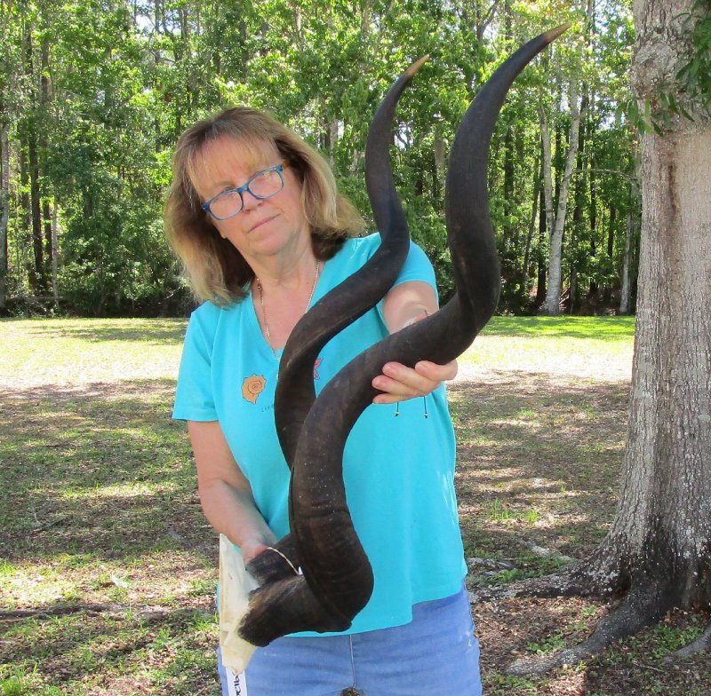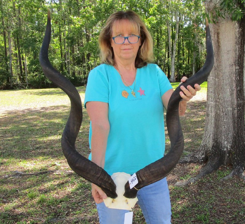 Kudu Horns on Skull Plate measuring approximately 46 inches (Tragelaphus strepsiceros).   Review all photos. The kudu horns are measured around the curl of the horn using a cloth tape measure -- NOT straight up and down with a wood ruler. Kudu horns on skull plate are perfect for hunting lodge decor and African themed decorating. The kudu horns are removed from the skull plate for shipping and each kudu horn can easily be made into a shofar or can be attached to the skull plate for wall decor. The kudu horns and skull plate are from a wild African kudu and will have imperfections normally found on all wild animal horns.