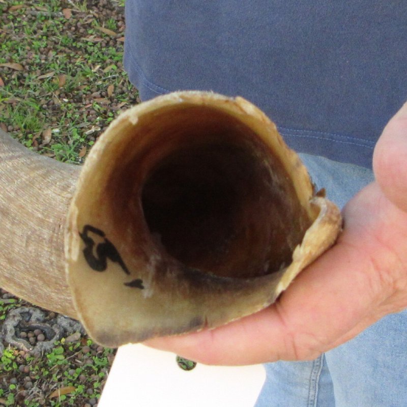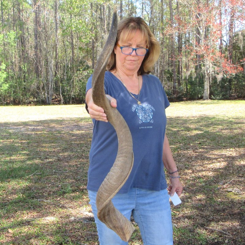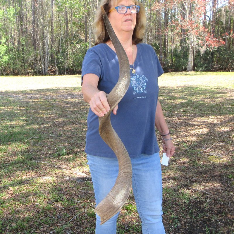 Kudu horn for sale (Tragelaphus angasi) imported from South Africa, measuring approximately 46 inch, measured around the curl of the horn - not straight. - Two spots with discoloration. Review photos. Kudu horns are used in making shofars, blowing horns, kudu horn instruments, furniture legs, lamps, sconces, knife handles, cane handles, inlaid crafts and numerous other taxidermy crafts.