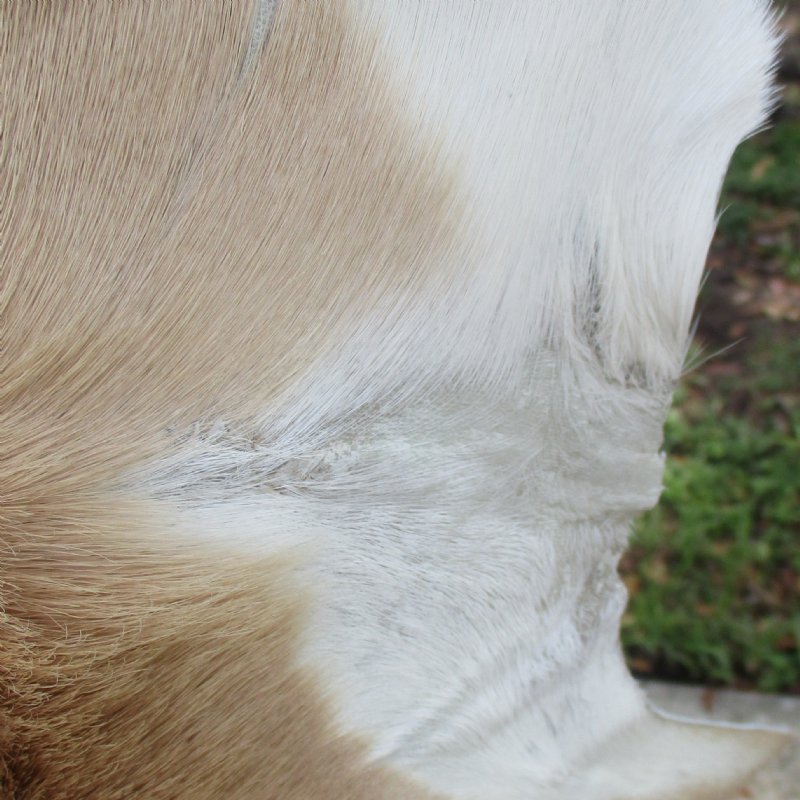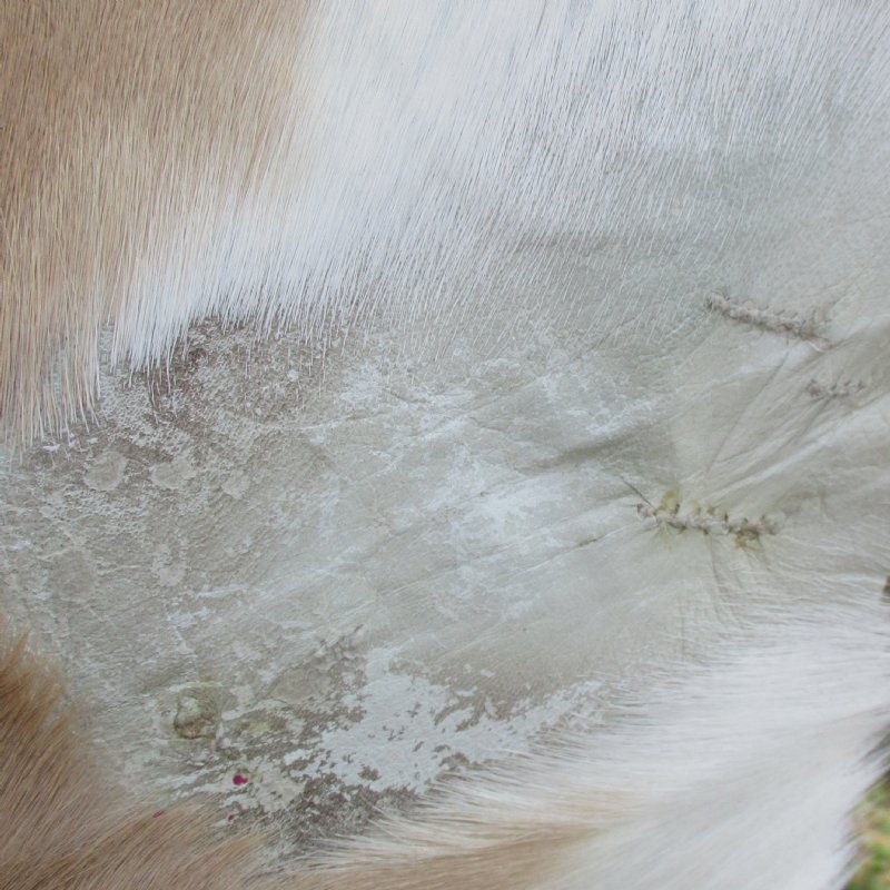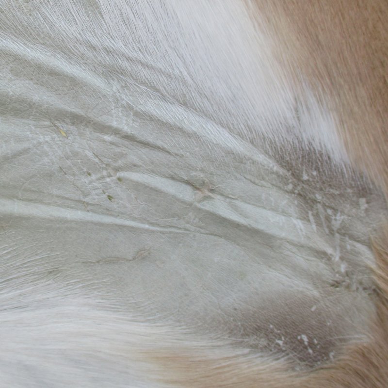 All our animal skins are Grade B and will have natural imperfections which may include areas of thinning/sparse hair due to shedding, bare spots, scratches, tiny holes, repair stitching and patches on the back of the hide.