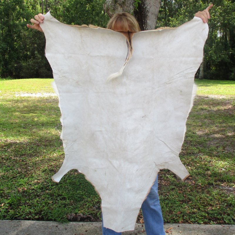 African Impala (Aeryceros melampus) skin rug, impala hide, imported from South Africa measuring approximately 46 inches long and 30 inches wide. This hide has visible stitching and tiny holes. - Review photos. This is a genuine impala skin, or impala hide from a wild African impala and is perfect for a furniture throw, animal skin wall decor and for a decorative animal skin rug. African impala skins or hides are also used in making impala skin pillows, purses and animal product crafts. This African impala skin has been tanned and is ready for use in your home or cabin.