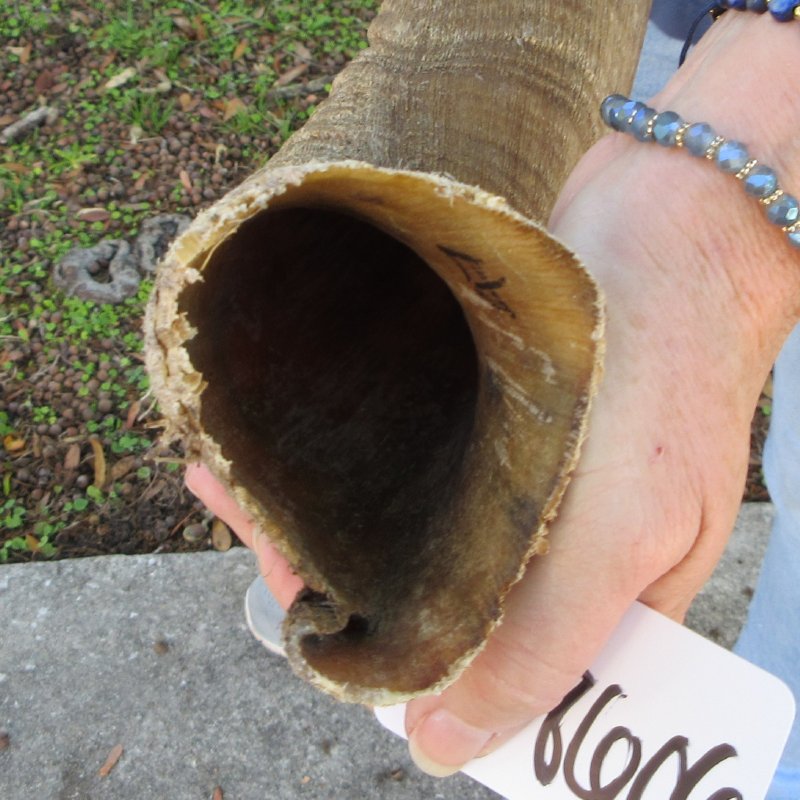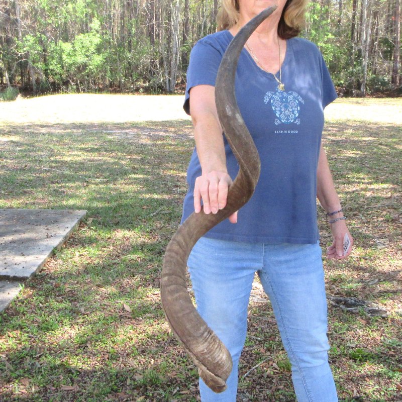 Kudu horn for sale (Tragelaphus angasi) imported from South Africa, measuring approximately 48 inch, measured around the curl of the horn - not straight. - Gouge and damage to tip of horn. Review photos. Kudu horns are used in making shofars, blowing horns, kudu horn instruments, furniture legs, lamps, sconces, knife handles, cane handles, inlaid crafts and numerous other taxidermy crafts.