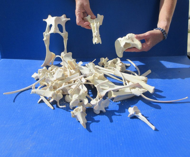 4 pound box of assorted sizes of various bones for sale. These bones are from wild boar; however, the assortment may include some raccoon, coyote, gator, or opossum bones. The box contains an assortment of ribs, shoulder blades, leg bones, vertebrae and others. They have been cleaned and whitened; however, some will have dried cartilage on the bone and have some patches of discoloration. These are Real Animal Bones - Not Replicas.