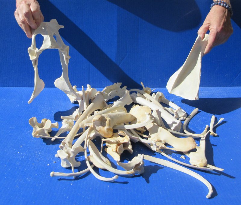 4 pound box of assorted sizes of various bones for sale. These bones are from wild boar; however, the assortment may include some raccoon, coyote, gator, or opossum bones. The box contains an assortment of ribs, shoulder blades, leg bones, vertebrae and others. They have been cleaned and whitened; however, some will have dried cartilage on the bone and have some patches of discoloration. These are Real Animal Bones - Not Replicas.