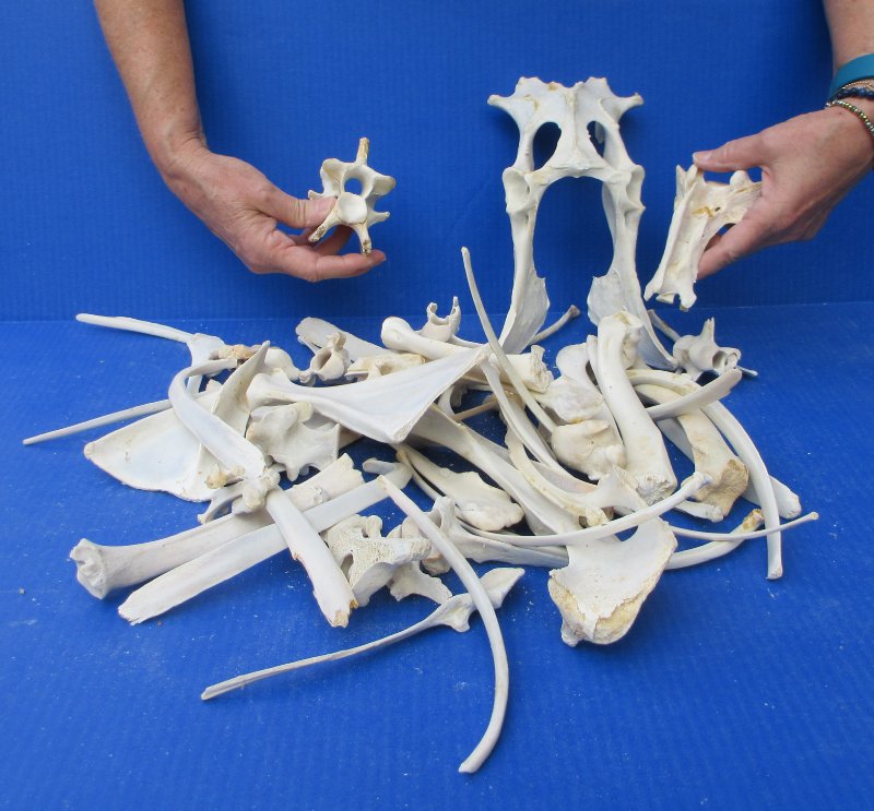 4 pound box of assorted sizes of various bones for sale. These bones are from wild boar; however, the assortment may include some raccoon, coyote, gator, or opossum bones. The box contains an assortment of ribs, shoulder blades, leg bones, vertebrae and others. They have been cleaned and whitened; however, some will have dried cartilage on the bone and have some patches of discoloration. These are Real Animal Bones - Not Replicas.