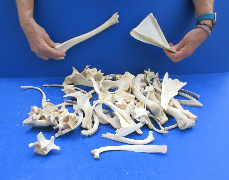 4 pound box of assorted sizes of various bones for sale. These bones are from wild boar; however, the assortment may include some raccoon, coyote, gator, or opossum bones. The box contains an assortment of ribs, shoulder blades, leg bones, vertebrae and others. They have been cleaned and whitened; however, some will have dried cartilage on the bone and have some patches of discoloration. These are Real Animal Bones - Not Replicas.