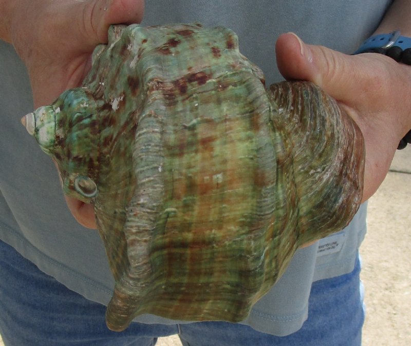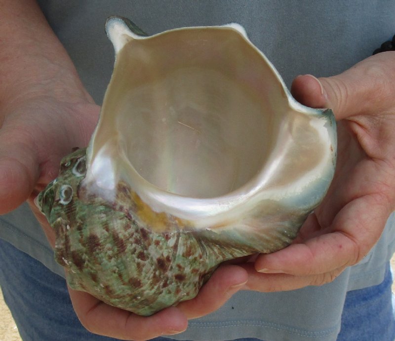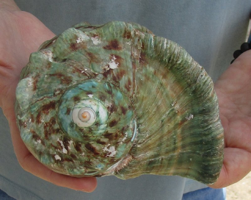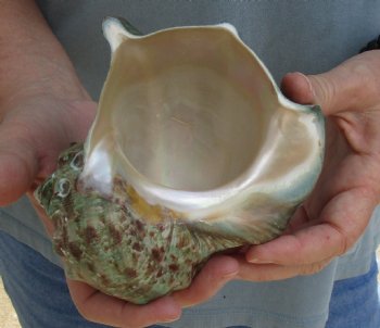 Turbo Marmoratus, green turban shell, measuring approximately 5 inches in length.  They will have natural imperfections from aging and living in the ocean, and may have surface cracks, chips on edges, broken tips, calcium build up, tiny holes, cuts, scratches, blemishes and scars. - Review Photos.  It is a large species of marine gastropod with a calcareous operculum in the family turbinidae.   The color pattern is green, marbled with white and rich brown.  The 6-7 whorls on the turbo marmoratus are flattened or concave above, rounded and bearing two nodose keels below, and a stronger nodose carina above.  It bears blunt tubercles, especially strong on the shoulders. Its large, circular aperture has a golden, pearly shine.  The base of the shell is produced.