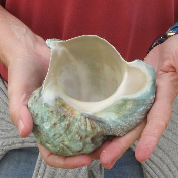 Turbo Marmoratus, green turban shell, measuring approximately 5 inches in length.  They will have natural imperfections from aging and living in the ocean, and may have surface cracks, chips on edges, broken tips, calcium build up, tiny holes, cuts, scratches, blemishes and scars. - Review Photos.  It is a large species of marine gastropod with a calcareous operculum in the family turbinidae.   The color pattern is green, marbled with white and rich brown.  The 6-7 whorls on the turbo marmoratus are flattened or concave above, rounded and bearing two nodose keels below, and a stronger nodose carina above.  It bears blunt tubercles, especially strong on the shoulders. Its large, circular aperture has a golden, pearly shine.  The base of the shell is produced.