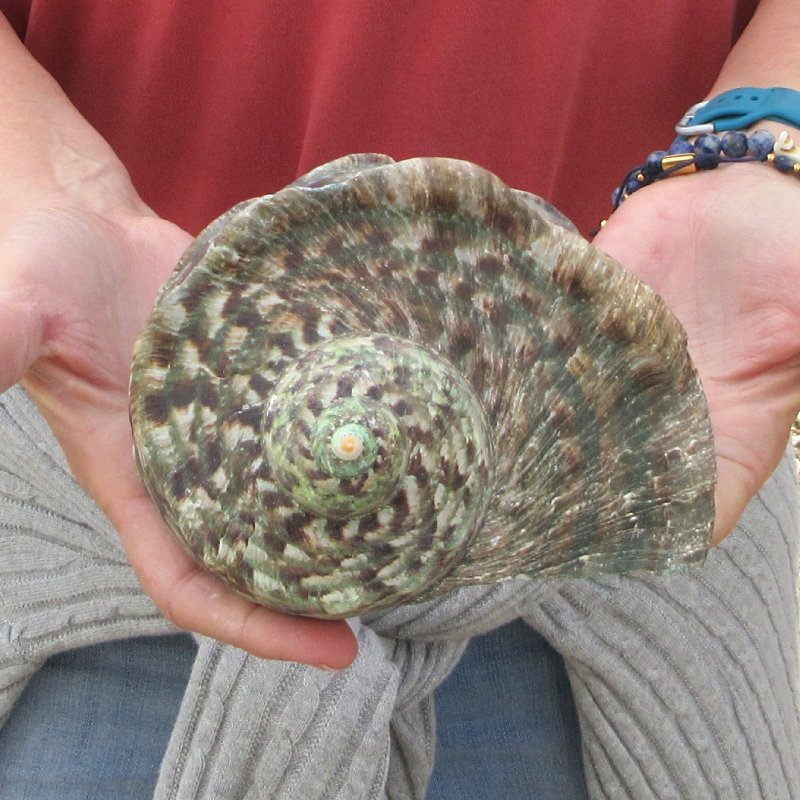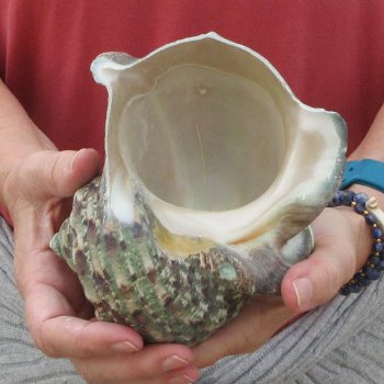 Turbo Marmoratus, green turban shell, measuring approximately 5 inches in length.  They will have natural imperfections from aging and living in the ocean, and may have surface cracks, chips on edges, broken tips, calcium build up, tiny holes, cuts, scratches, blemishes and scars. - Review Photos.  It is a large species of marine gastropod with a calcareous operculum in the family turbinidae.   The color pattern is green, marbled with white and rich brown.  The 6-7 whorls on the turbo marmoratus are flattened or concave above, rounded and bearing two nodose keels below, and a stronger nodose carina above.  It bears blunt tubercles, especially strong on the shoulders. Its large, circular aperture has a golden, pearly shine.  The base of the shell is produced.