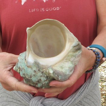 Turbo Marmoratus, green turban shell, measuring approximately 5 inches in length.  They will have natural imperfections from aging and living in the ocean, and may have surface cracks, chips on edges, broken tips, calcium build up, tiny holes, cuts, scratches, blemishes and scars. - Review Photos.  It is a large species of marine gastropod with a calcareous operculum in the family turbinidae.   The color pattern is green, marbled with white and rich brown.  The 6-7 whorls on the turbo marmoratus are flattened or concave above, rounded and bearing two nodose keels below, and a stronger nodose carina above.  It bears blunt tubercles, especially strong on the shoulders. Its large, circular aperture has a golden, pearly shine.  The base of the shell is produced.