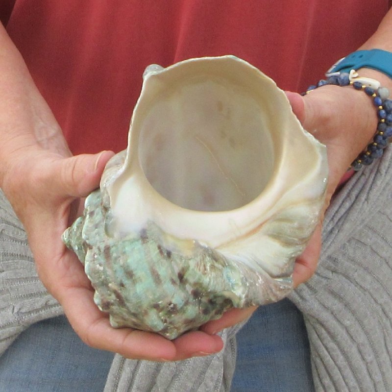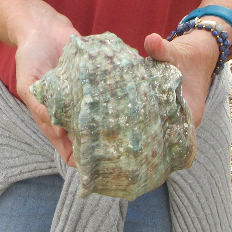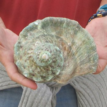 Turbo Marmoratus, green turban shell, measuring approximately 5 inches in length.  They will have natural imperfections from aging and living in the ocean, and may have surface cracks, chips on edges, broken tips, calcium build up, tiny holes, cuts, scratches, blemishes and scars. - Review Photos.  It is a large species of marine gastropod with a calcareous operculum in the family turbinidae.   The color pattern is green, marbled with white and rich brown.  The 6-7 whorls on the turbo marmoratus are flattened or concave above, rounded and bearing two nodose keels below, and a stronger nodose carina above.  It bears blunt tubercles, especially strong on the shoulders. Its large, circular aperture has a golden, pearly shine.  The base of the shell is produced.