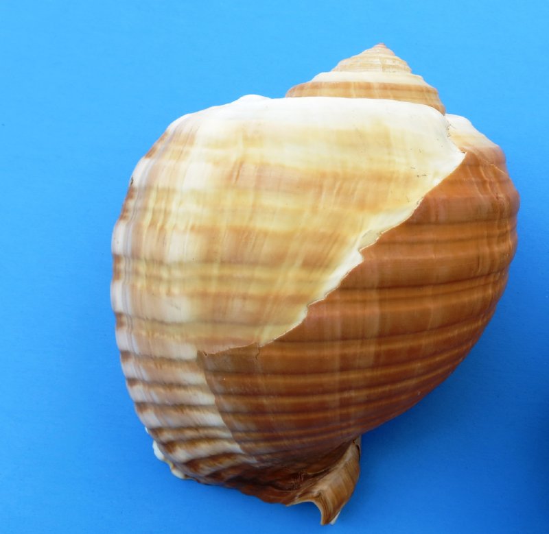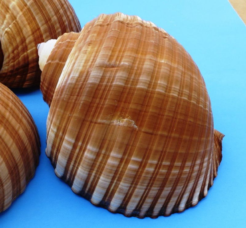 Wholesale 5 to 5-3/4 inch Tonna Olearium shells, or Tonna Cepa shells for hermit crab homes are brown light weight shells with a wide mouth opening, perfect shells for large hermit crabs.  There will be a label attached "Made in the Philippines".  This is a requirement of the U.S Customs Department.  All items imported into the U.S must have a country of origin label.