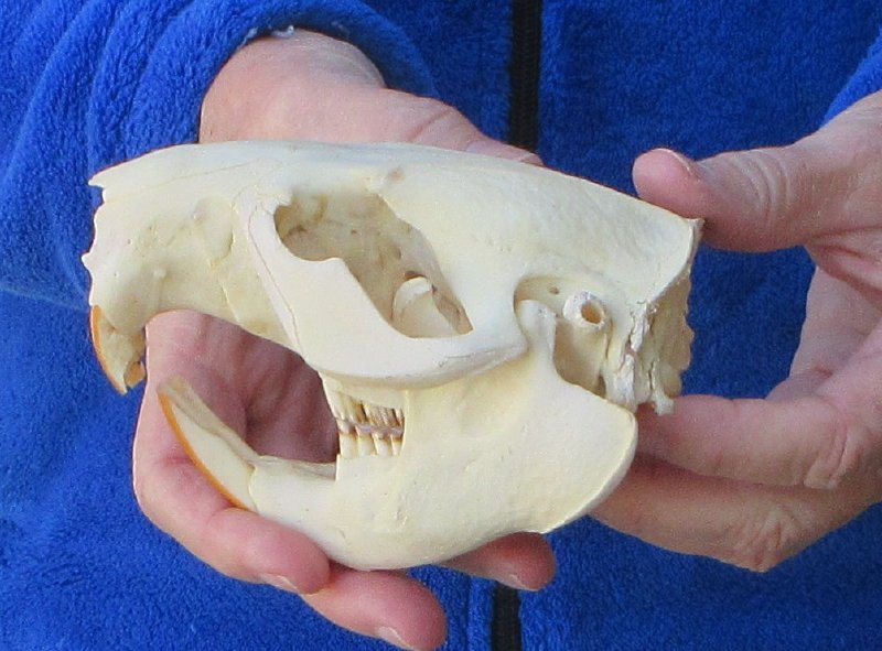 North American Beaver skull (castor), a small animal skull measuring approximately 5 inches long and 3-1/4 inches wide.  Mouth glued shut - Review photos. This beaver skull is from a wild beaver and will have natural imperfections found on all wild animal skulls. Our beaver skulls have been cleaned and whitened; however, these skulls may have patches of discoloration.