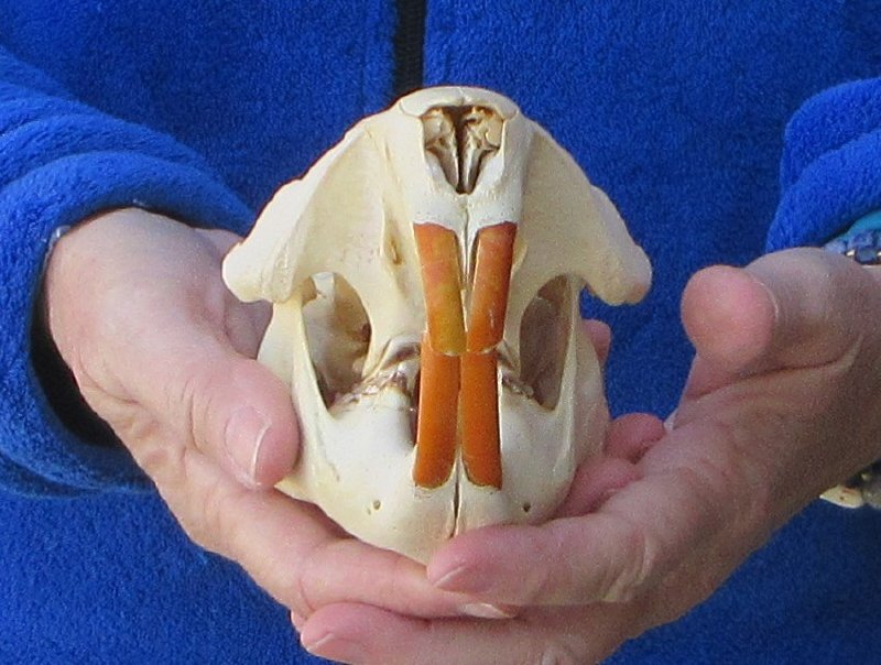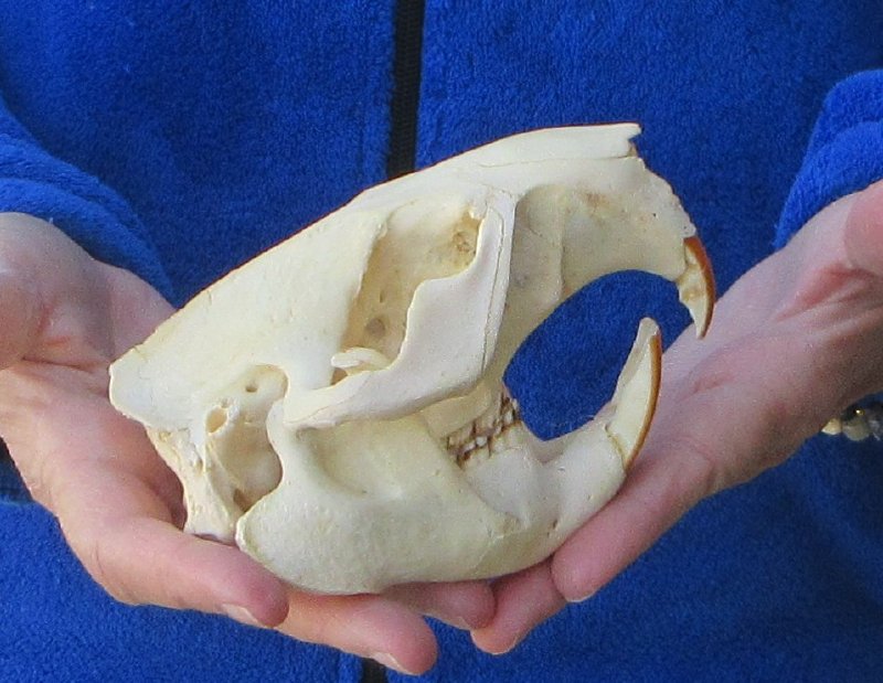 North American Beaver skull (castor), a small animal skull measuring approximately 5 inches long and 3-1/2 inches wide.  Mouth glued shut - Review photos. This beaver skull is from a wild beaver and will have natural imperfections found on all wild animal skulls. Our beaver skulls have been cleaned and whitened; however, these skulls may have patches of discoloration.