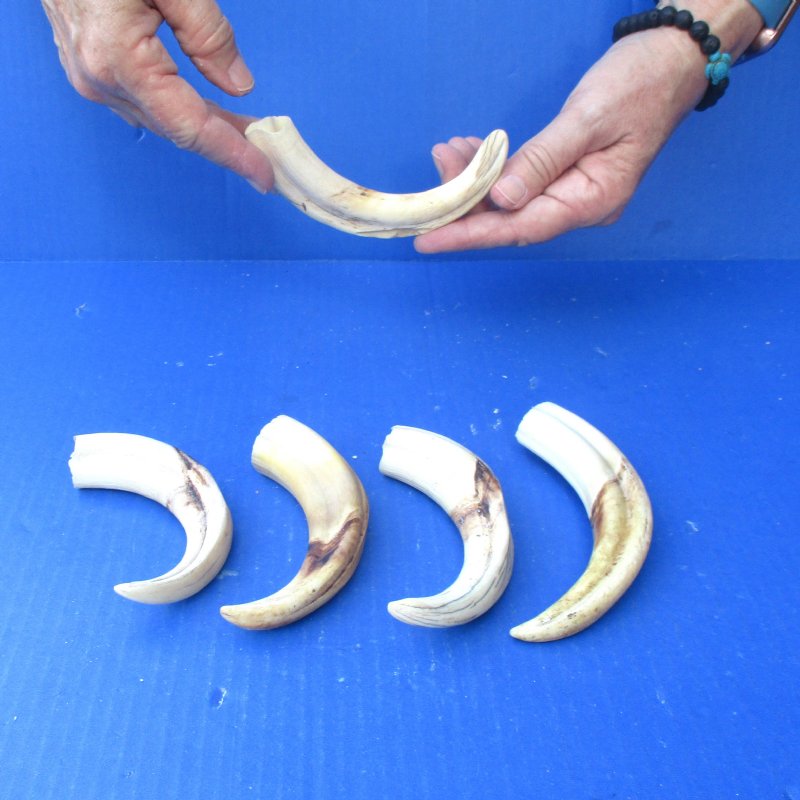 5 pc lot of warthog tusks, warthog ivory for carving measuring approximately 6 inches long. Warthog tusks and warthog ivory for carving are measured around the curve of the tusk using a cloth tape measure - NOT straight using a wood ruler. Warthog tusks and warthog ivory are used for carving, making handles, in the art of scrimshaw and in taxidermy crafts.