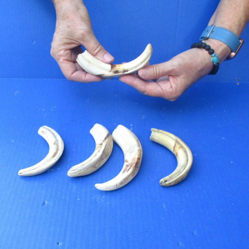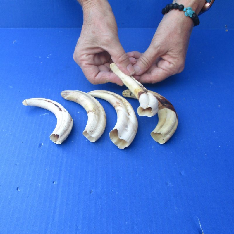 5 pc lot of warthog tusks, warthog ivory for carving measuring approximately 6 inches long. Warthog tusks and warthog ivory for carving are measured around the curve of the tusk using a cloth tape measure - NOT straight using a wood ruler. Warthog tusks and warthog ivory are used for carving, making handles, in the art of scrimshaw and in taxidermy crafts.