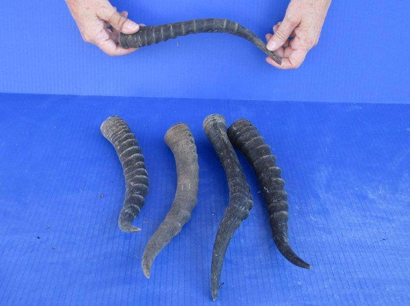 5 piece lot of Female Blesbok horns or blesbuck horns from wild African blesbok, with natural imperfections, measuring approximately 10 to 13 inches long measured around the curve of the horns -- not straight.  Blesbok horns, blesbuck horns, are used in making furniture, cane handles and in numerous taxidermy crafts. These are real blesbok horns and they will have natural imperfections from living in the wild and using their horns for fighting, such as tiny chips and small splits at the mouth opening, tiny cuts, scars, blemishes, etc.