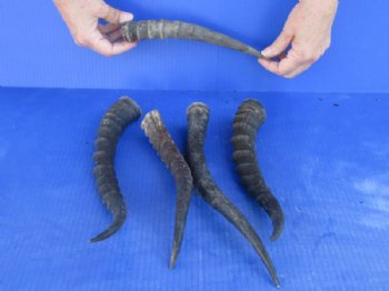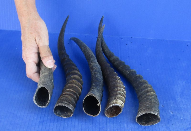 5 piece lot of Female Blesbok horns or blesbuck horns from wild African blesbok, with natural imperfections, measuring approximately 10 to 13 inches long measured around the curve of the horns -- not straight.   Blesbok horns, blesbuck horns, are used in making furniture, cane handles and in numerous taxidermy crafts. These are real blesbok horns and they will have natural imperfections from living in the wild and using their horns for fighting, such as tiny chips and small splits at the mouth opening, tiny cuts, scars, blemishes, etc.