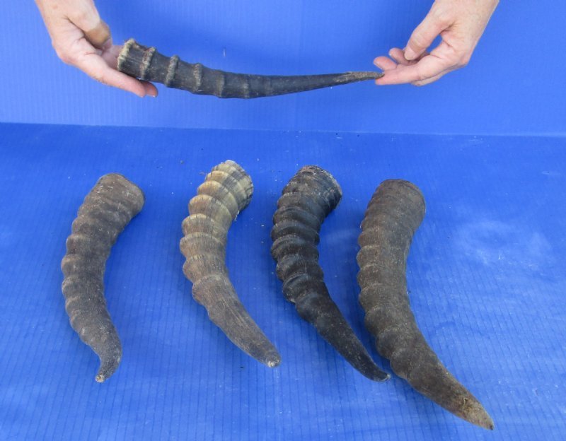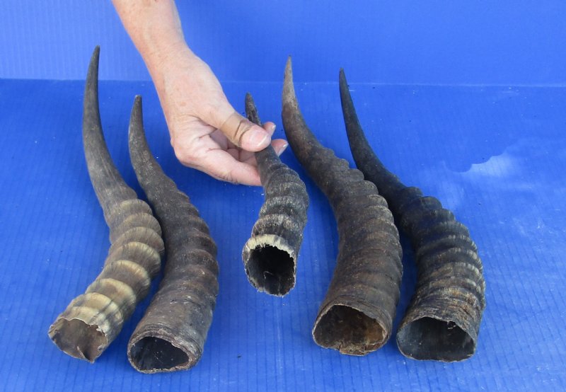 5 piece lot of Male Blesbok horns or blesbuck horns from wild African blesbok, with natural imperfections, measuring approximately 10 to 14 inches long measured around the curve of the horns -- not straight.  Blesbok horns, blesbuck horns, are used in making furniture, cane handles and in numerous taxidermy crafts. These are real blesbok horns and they will have natural imperfections from living in the wild and using their horns for fighting, such as tiny chips and small splits at the mouth opening, tiny cuts, scars, blemishes, etc.