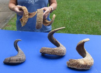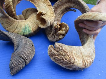5 piece lot of B-Grade sheep (Ovis Aries) horns that measures approximately 18 to 30 inches in size. This is a damaged / discounted horns - These horns will have natural imperfections including gouges, holes, splits, missing sections of top layer, etc. from aging and fighting - review photos.  Sheep horns are measured around the curl of the horn - not straight.  Sheep horns are used in making blowing horns, furniture legs, lamps, sconces, knife handles, cane handles, inlaid crafts and numerous other taxidermy crafts. Our ram horns are a by-product of the farming industry and Government culling programs. Our ram horns are imported from India and South Africa.