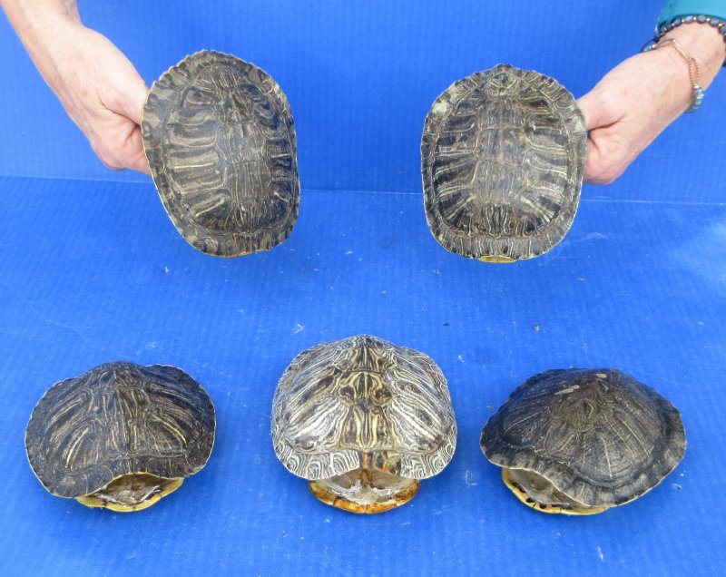 5 piece lot of Red Eared Slider Turtle Shells measuring approximately 5 to 6 inches long.  Review all photos. The red eared slider is a cold-blooded animal and will usually be found during the day sitting in the sun on a rock, log, or any stumps that are near the water. Some red eared sliders can even be found stacked up to three high, basking in the sun. While the red eared slider is very hard of hearing, they are sensitive to vibration and are very alert while they are basking. These vibrations allow the red eared slider the time to make their hasty retreat into the water if they feel threatened in any way. These are empty turtle shells from real turtles and will have natural imperfections from living and aging in nature.