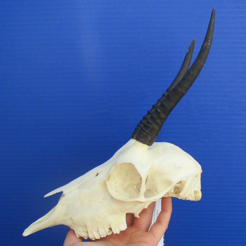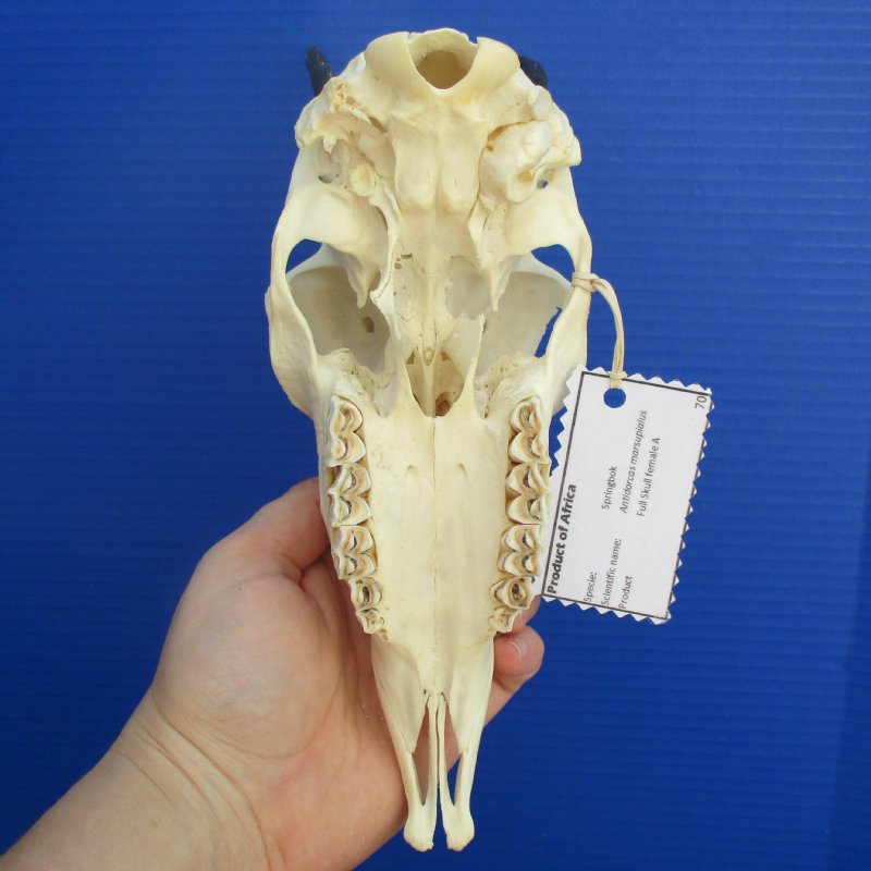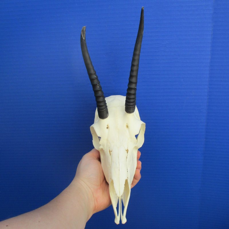 Female Springbok Skull (Antidorcas marsupialis) for sale with horns measuring approximately 5 to 6 inches, measured around the curl of the horns. Some damage to horn. - Review all photos. This springbok skull and horns is from a wild African springbok and will have imperfections caused by the animal living in the wild and the natural aging process.