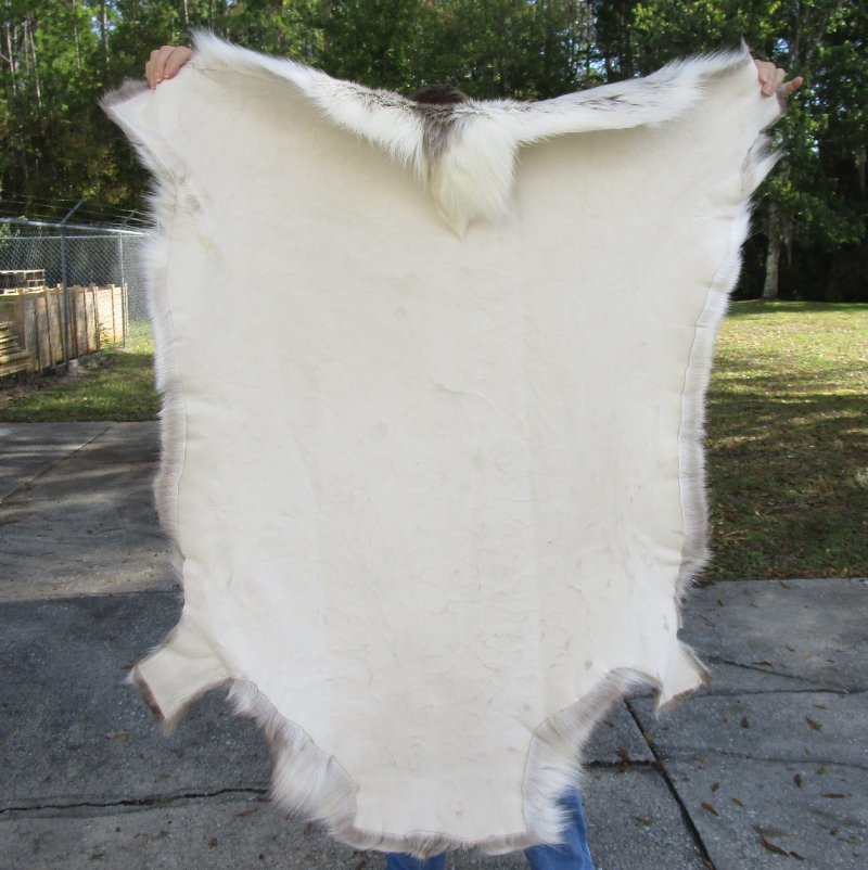 Reindeer skin, hide (Rangifer Tarandus) farm raised, imported from Finland measuring approximately 50 inches long by 42 inches wide. Review all photos. This reindeer pelt, reindeer hide or reindeer skin was harvested, cleaned and professionally tanned in Finland. Reindeer hides are a natural and comfortable product. Reindeer skins and reindeer pelts look great as wall decoration in a cabin or den, as furniture throws or decorative rugs but should not be walked or stepped on, to prevent shedding and breaking of the fur. Reindeer skins and hides should be cleaned once a year with a standard vacuum on the lowest power