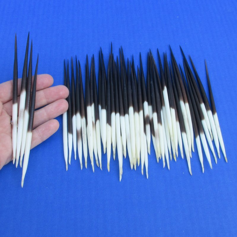 50 thick/fat African porcupine quills (Hystrix africaeaustralis) measuring approximately 5 to 6 inches long.  These are good clean quillsThe bundle may contain a few quills either below or above the size range you ordered.  The thickness will vary within the bundle also. African Porcupine quills are used in American Indian crafts. Quillwork is perhaps the oldest form of embroidery used by Native Americans. Quills were folded, twisted, wrapped, plaited and sewn using a wide range of techniques to decorate articles of clothing, bags, knife sheaths, baskets, wooden handles and pipe stems. Quillwork has been, and continues to be used to decorate the basketry of various Native American tribes.