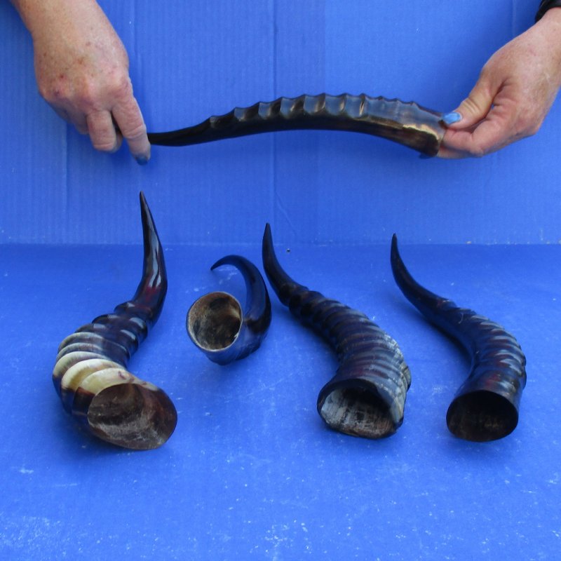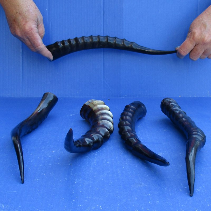 5 piece lot of polished blesbok horns (not a pair) from wild African Blesbok, measuring approximately 12-1/4 to 13-1/2 inches long, around the curve of the horn using a cloth tape measure. - Review all photos. Blesbok horns are used in making furniture, cane handles and in numerous taxidermy crafts. These are real polished blesbok horns and they will have natural imperfections from living in the wild and using their horns for fighting, such as tiny chips and small splits at the mouth opening, tiny cuts, scars, blemishes, etc.
