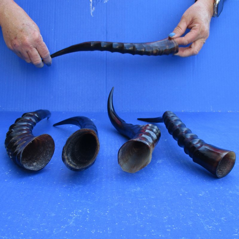 5 piece lot of polished blesbok horns (not a pair) from wild African Blesbok, measuring approximately 12-1/2 to 14 inches long, around the curve of the horn using a cloth tape measure. - Review all photos. Blesbok horns are used in making furniture, cane handles and in numerous taxidermy crafts. These are real polished blesbok horns and they will have natural imperfections from living in the wild and using their horns for fighting, such as tiny chips and small splits at the mouth opening, tiny cuts, scars, blemishes, etc.