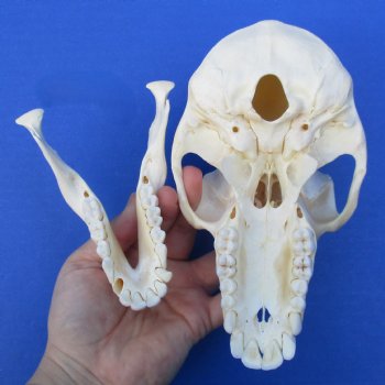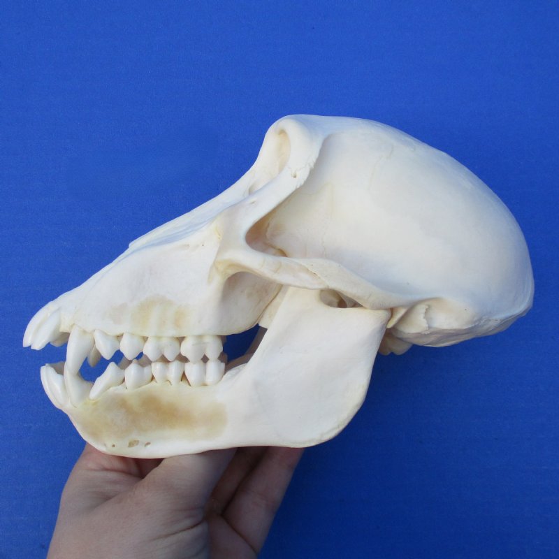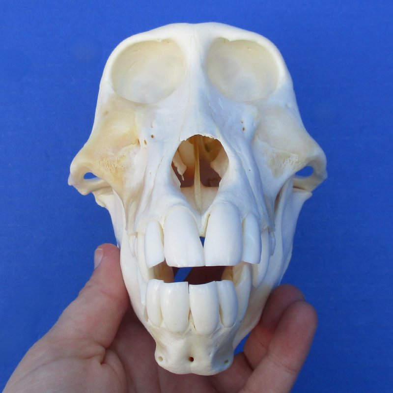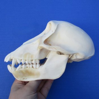 Female Chacma Baboon Skull (Papio ursinus) for sale, measuring approximately 6-3/4 inches long and 3-3/4 inches wide. - Tooth missing. Review all photos. The Chacma Baboon, also known as the Cape Baboon, is, like all other baboons, from the Old World monkey family. It is one of the largest of all monkeys. All of our baboon skulls are commercial grade and imperfect. They will have imperfections due to the natural aging process and living in the wild--scars, blemishes, chipped/broken/missing teeth, etc. This baboon skull was imported from South Africa and was professionally cleaned. It has been cleared by the U.S Fish and Wildlife Services and U.S Customs Services for legal entry into the United States.