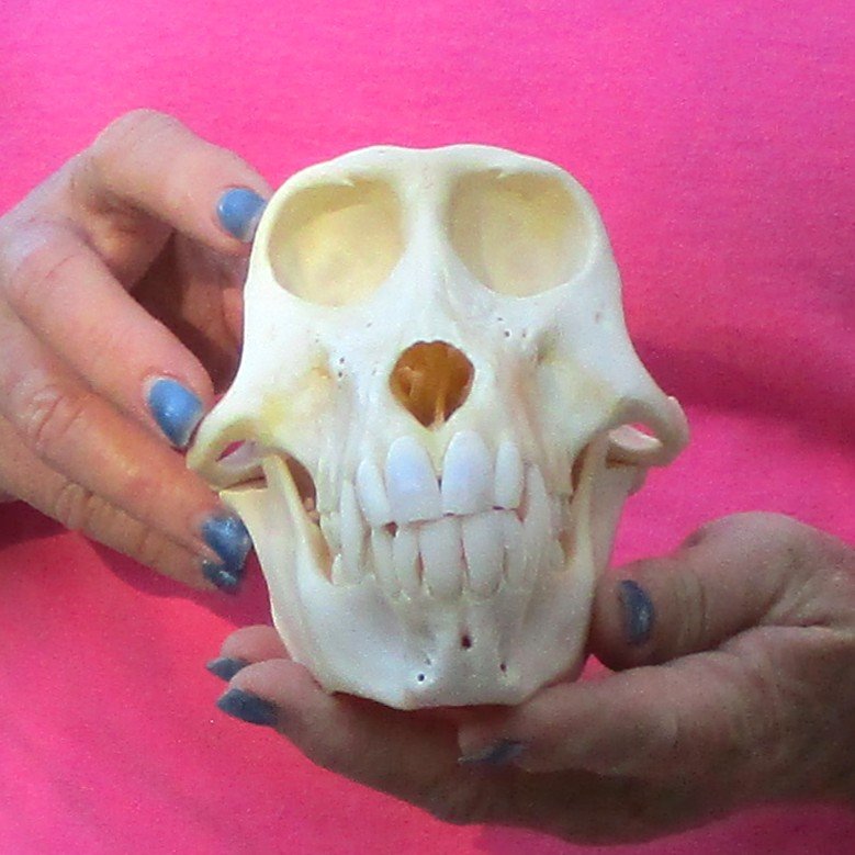 Female Chacma Baboon Skull (Papio ursinus) for sale, measuring approximately 6-3/4 inches long and 4 inches wide.  -M Discoloration. Review all photos. The Chacma Baboon, also known as the Cape Baboon, is, like all other baboons, from the Old World monkey family. It is one of the largest of all monkeys. All of our baboon skulls are commercial grade and imperfect. They will have imperfections due to the natural aging process and living in the wild--scars, blemishes, chipped/broken/missing teeth, etc. This baboon skull was imported from South Africa and was professionally cleaned. It has been cleared by the U.S Fish and Wildlife Services and U.S Customs Services for legal entry into the United States.