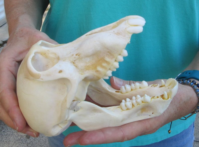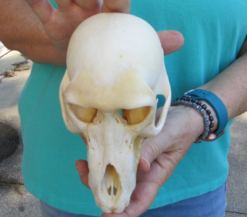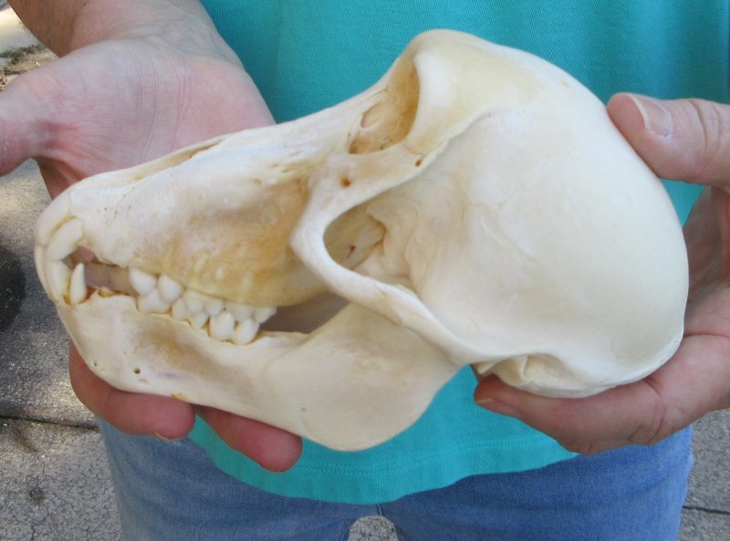 All of our baboon skulls are commercial grade and imperfect.  They will have imperfections due to the natural aging process and living in the wild--scars, blemishes, broken/missing teeth, etc.  This baboon skull was professionally cleaned and cleared by the U.S Fish and Wildlife Services and U.S Customs Services for legal entry into the United States.