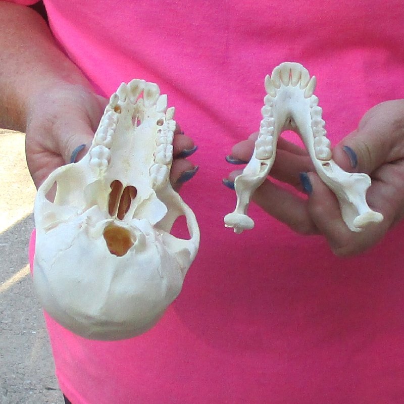 Female Chacma Baboon Skull (Papio ursinus) for sale, measuring approximately 6 inches long and 3-1/2 inches wide.  -Review all photos. The Chacma Baboon, also known as the Cape Baboon, is, like all other baboons, from the Old World monkey family. It is one of the largest of all monkeys. All of our baboon skulls are commercial grade and imperfect. They will have imperfections due to the natural aging process and living in the wild--scars, blemishes, chipped/broken/missing teeth, etc. This baboon skull was imported from South Africa and was professionally cleaned. It has been cleared by the U.S Fish and Wildlife Services and U.S Customs Services for legal entry into the United States.