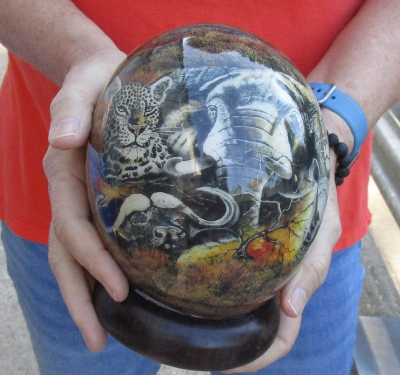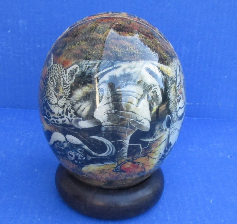 6 inch tall South African Decoupage Ostrich Egg. This beautiful decoupage ostrich egg has the African Big 5 animals: elephant, lion, leopard, rhino and cape buffalo and the African Map. This Ostrich egg comes with a wood bangle stand.  All our decoupage African wildlife ostrich eggs were imported from South Africa and have been cleared for legal entry into the U.S by the U.S Fish and Wildlife Department and U.S. Customs. These eggs are beautiful and will blend in any d©cor and look great in any room in the house. Decoupage ostrich eggs also make wonderful gifts.