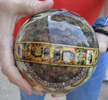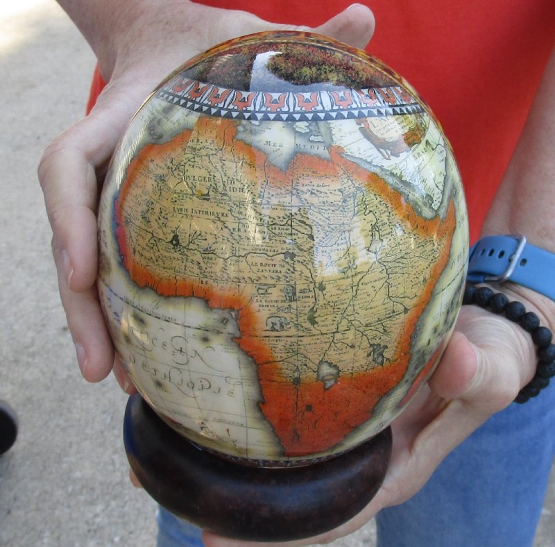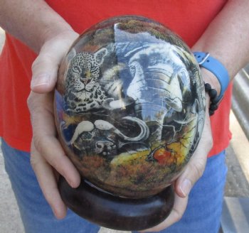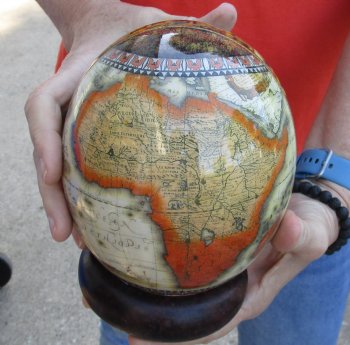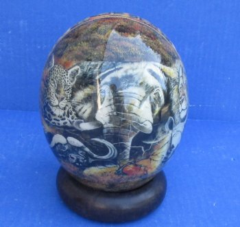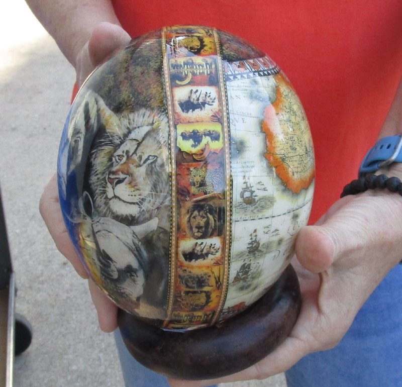 6 inch South African Decoupage Ostrich Egg with the African Big 5 Animals and Map with wooden stand for sale - $45