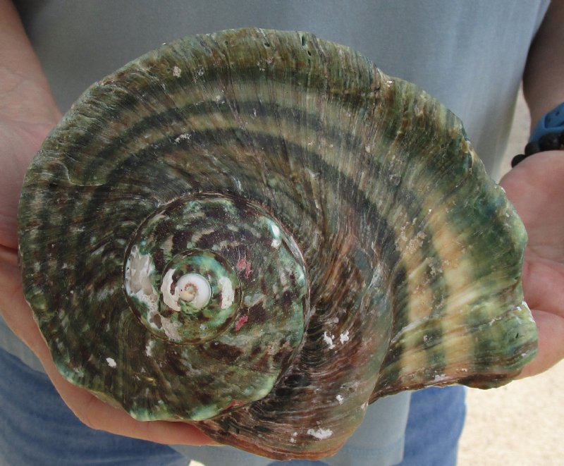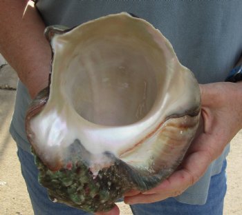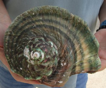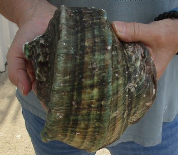 Turbo Marmoratus, green turban shell, measuring approximately 6 inches in length.  They will have natural imperfections from aging and living in the ocean, and may have surface cracks, chips on edges, broken tips, calcium build up, tiny holes, cuts, scratches, blemishes and scars. - Review Photos.  It is a large species of marine gastropod with a calcareous operculum in the family turbinidae.   The color pattern is green, marbled with white and rich brown.  The 6-7 whorls on the turbo marmoratus are flattened or concave above, rounded and bearing two nodose keels below, and a stronger nodose carina above.  It bears blunt tubercles, especially strong on the shoulders. Its large, circular aperture has a golden, pearly shine.  The base of the shell is produced.