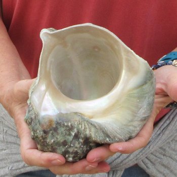 Turbo Marmoratus, green turban shell, measuring approximately 6 inches in length. They will have natural imperfections from aging and living in the ocean, and may have surface cracks, chips on edges, broken tips, calcium build up, tiny holes, cuts, scratches, blemishes and scars. - Review Photos. It is a large species of marine gastropod with a calcareous operculum in the family turbinidae. The color pattern is green, marbled with white and rich brown. The 6-7 whorls on the turbo marmoratus are flattened or concave above, rounded and bearing two nodose keels below, and a stronger nodose carina above. It bears blunt tubercles, especially strong on the shoulders. Its large, circular aperture has a golden, pearly shine. The base of the shell is produced.