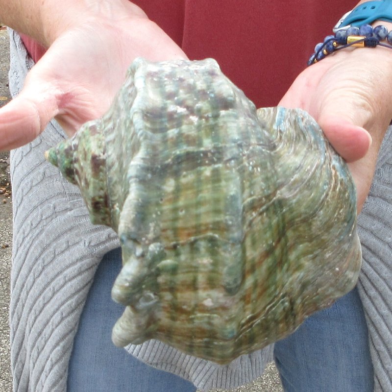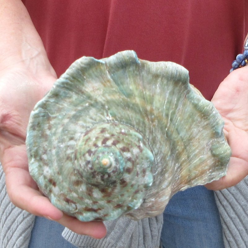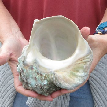 Turbo Marmoratus, green turban shell, measuring approximately 6 inches in length.  They will have natural imperfections from aging and living in the ocean, and may have surface cracks, chips on edges, broken tips, calcium build up, tiny holes, cuts, scratches, blemishes and scars. - Review Photos.  It is a large species of marine gastropod with a calcareous operculum in the family turbinidae.   The color pattern is green, marbled with white and rich brown.  The 6-7 whorls on the turbo marmoratus are flattened or concave above, rounded and bearing two nodose keels below, and a stronger nodose carina above.  It bears blunt tubercles, especially strong on the shoulders. Its large, circular aperture has a golden, pearly shine.  The base of the shell is produced.