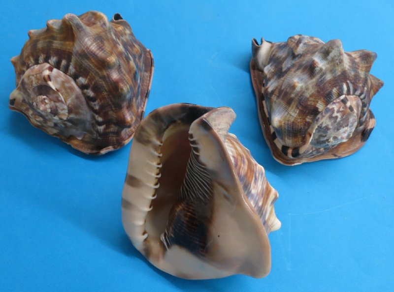 Wholesale king helmet shells, commercial grade, a large shell with rich brown tones, measuring between 6 inches and 6-3/4 inches. The king helmet, Cassis tuberosa, is a species of very large sea snail with a solid, heavy shell, a marine gastropod mollusc in the family Cassidae, the helmet shells and their allies. The shell of this species has been used for creating cameos. This species occurs in the Western Atlantic Ocean in: North Carolina, Florida, Mexico, Honduras, Colombia, Costa Rica, Panama, Colombia, Venezuela, Bermuda, Bahamas, Cuba, Hispaniola, Puerto Rico, Virgin Islands, Leeward Islands, Windward Islands, Brazil, and in the eastern Atlantic Ocean at the Cape Verde Islands.