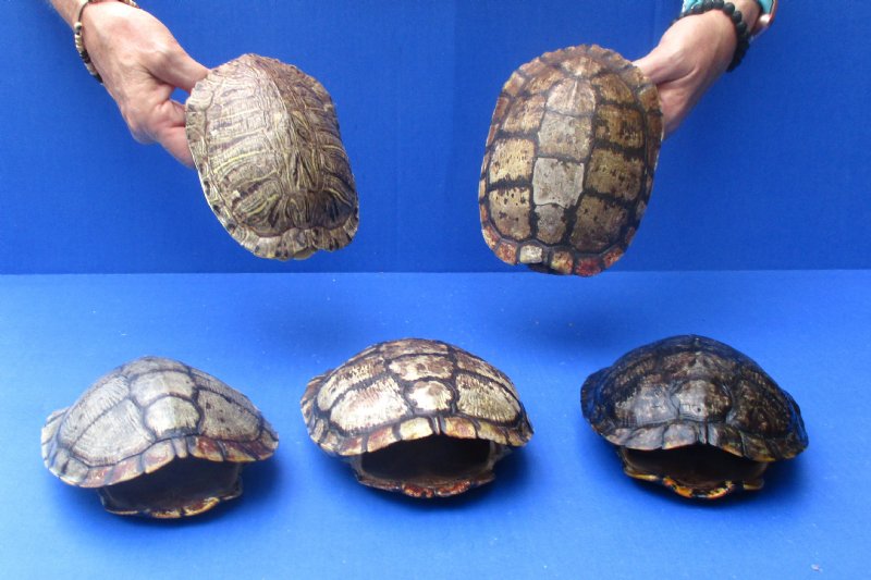 5 piece lot of Red Eared Slider Turtle Shells measuring approximately 6 inches long by 4-1/2 inches wide. - Missing piece on shell. Review all photos. The red eared slider is a cold-blooded animal and will usually be found during the day sitting in the sun on a rock, log, or any stumps that are near the water. Some red eared sliders can even be found stacked up to three high, basking in the sun. While the red eared slider is very hard of hearing, they are sensitive to vibration and are very alert while they are basking. These vibrations allow the red eared slider the time to make their hasty retreat into the water if they feel threatened in any way. These are empty turtle shells from real turtles and will have natural imperfections from living and aging in nature.