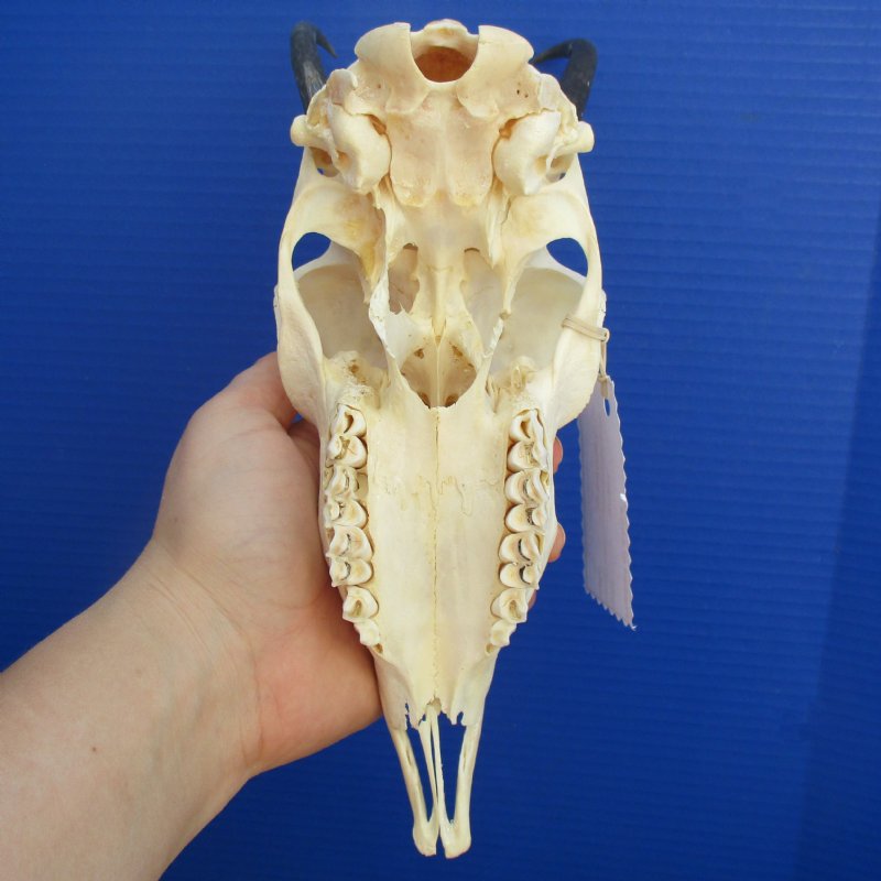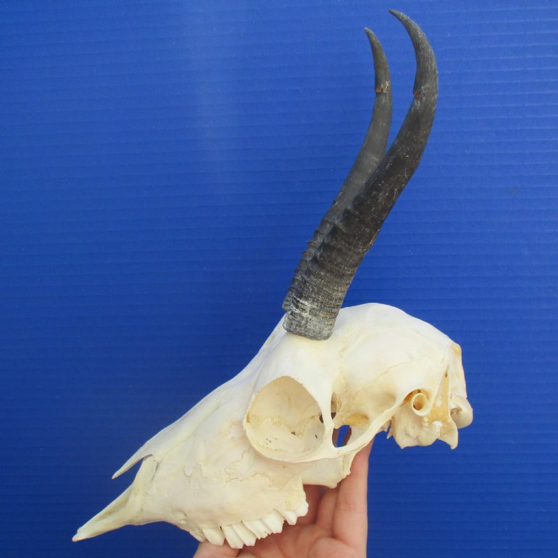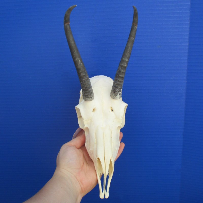 Female Springbok Skull (Antidorcas marsupialis) for sale with horns measuring approximately 6 to 7 inches, measured around the curl of the horns. Some damage to horns. - Review all photos. This springbok skull and horns is from a wild African springbok and will have imperfections caused by the animal living in the wild and the natural aging process.