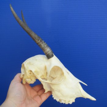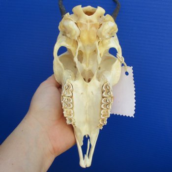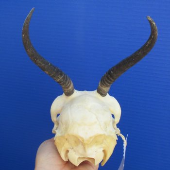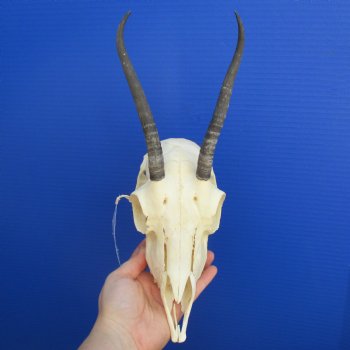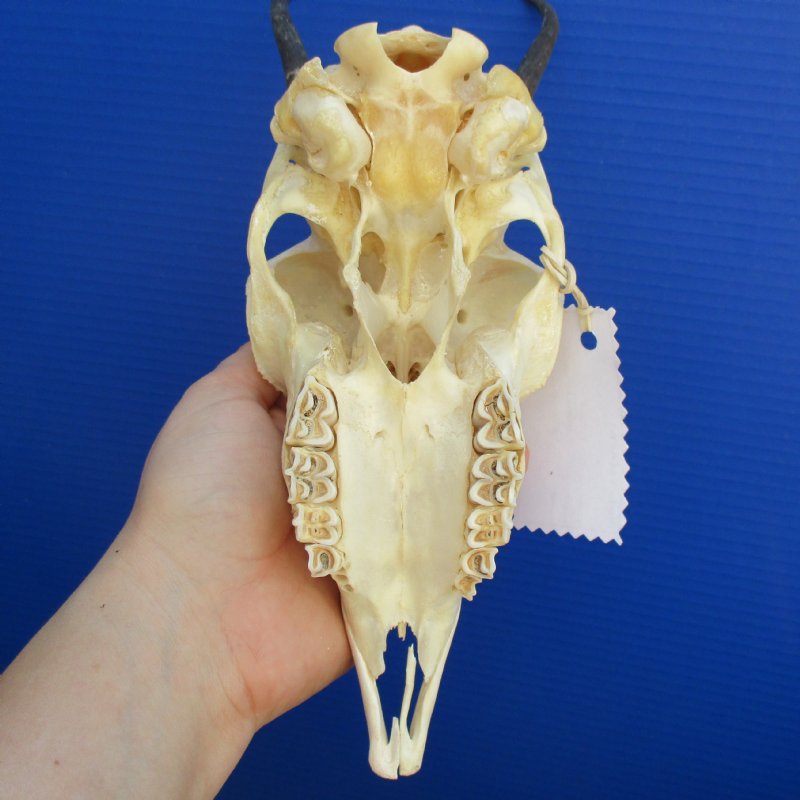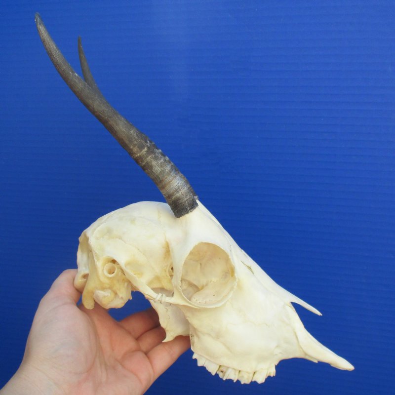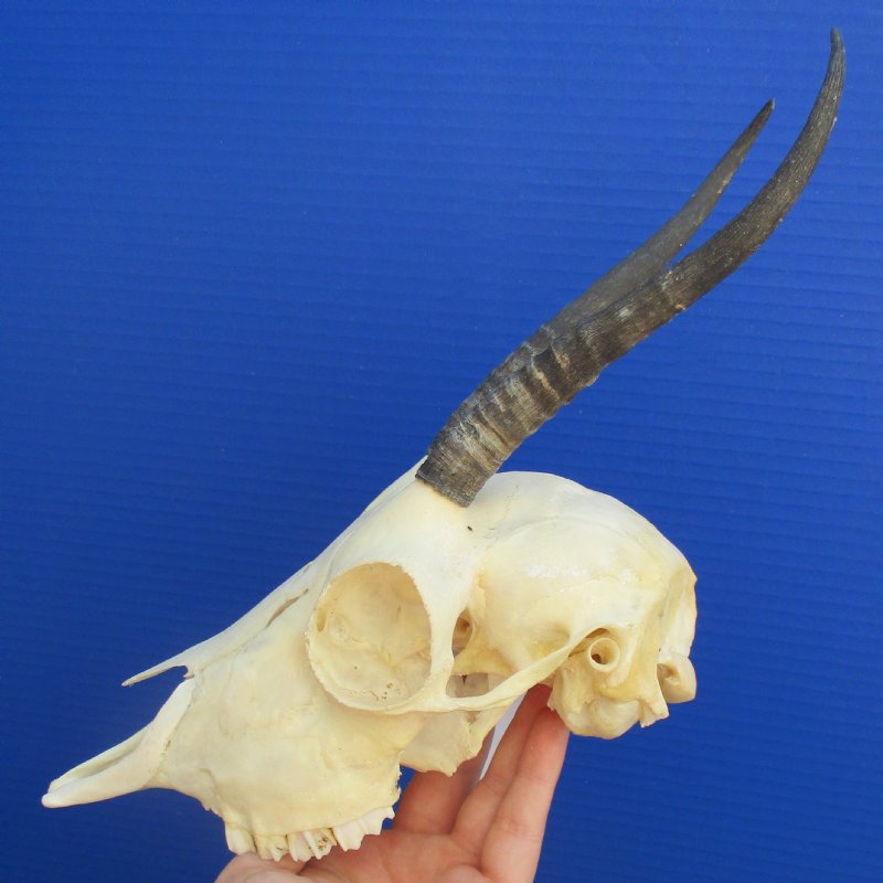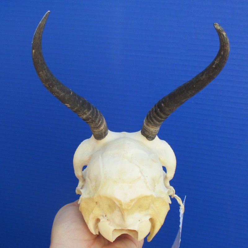 Female Springbok Skull (Antidorcas marsupialis) for sale with horns measuring approximately 6 to 7 inches, measured around the curl of the horns. Some teeth missing and damage to skull. - Review all photos. This springbok skull and horns is from a wild African springbok and will have imperfections caused by the animal living in the wild and the natural aging process.