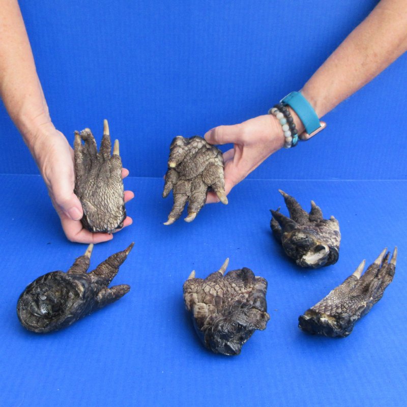 6 piece lot of Alligator Feet for sale, rough cut and preserved, measuring approximately 5 to 6 inches long. The ends of the feet have been painted black - Review photos.  The alligator feet will have a strong odor from the preservation process which will subside once aired out. These are Real Gator Feet - Not Replicas. They will have natural imperfections. These alligator feet come from gator farms where the gators are harvested for their meat and hide.