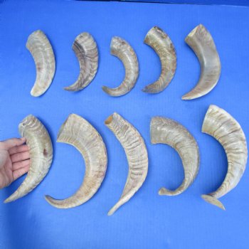 10 piece lot of Polished Merino Sheep Horns (Ovis Aries) with each horn measuring 7 to 16 inches in size, measured around the curl of the horn - not straight - using a cloth tape measure. These sheep horns will have natural imperfections including, gouges, holes, splits, missing sections of top layer, etc. from aging and fighting. Some parts of the horn are polished to a smooth shine while other parts are polished and the natural ridges are visible and can be felt - Review photos. Our horns are a by-product of the farming industry and Government culling programs and are imported from India and South Africa.
